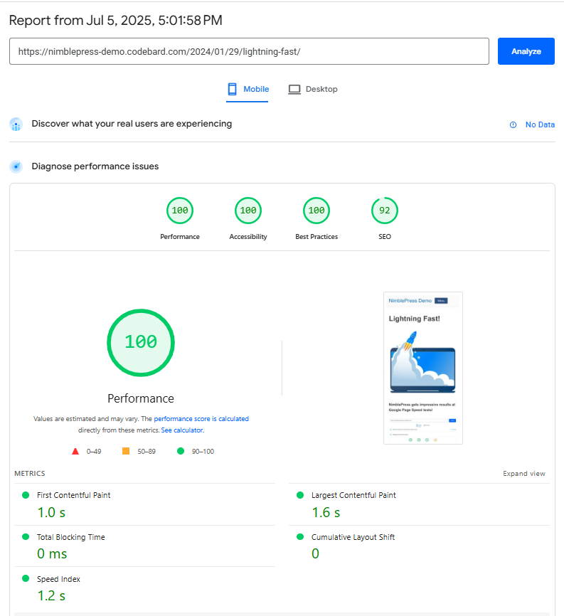 On top of this, the test is made with slow 4G throttling. The result is 100 performance score.